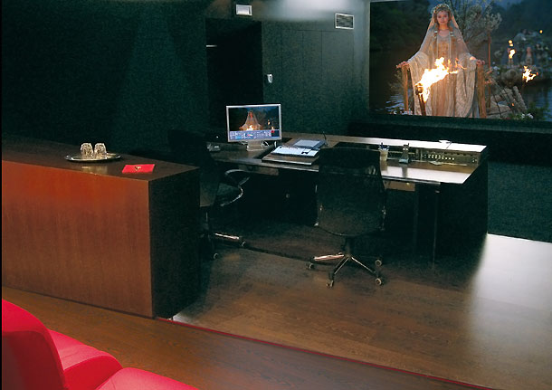 Damit bietet Arri jetzt zwei Möglichkeiten für Color Grading unter realen Kinobedingungen an: die High-End-DI-Variante in der »Lustre Master Grading Suite« und die preisgünstigere primäre Version in der neuen »Lustre RGB Grading Suite«. In beiden Suites kommt das Farbkorrektursystem Lustre von Autodesk zum Einsatz. In der neuen, etwas einfacheren Suite kann der Lichtbestimmer vom zentralen Pult aus die Primärfarben (Rot, Grün, Blau) von Filmeinstellungen sowohl dynamisch als auch in winzigsten Schritten verändern. Auf der über 4 m breiten Leinwand können die Bildfseitenverhältnisse 1:1,85 und Cinemascope in 2K-Qualität projiziert werden.