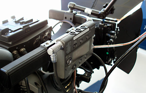 Hier kommt der bekannte SRW-1 ohne Prozessorteil zum Einsatz. Er kann direkt am Kamerakörper aufgesteckt werden und stellt beim Andocken auch gleich die elektrischen Verbindungen her, man kommt also beim Anschluss des Recorders ohne zusätzliche Kabelverbindung aus.