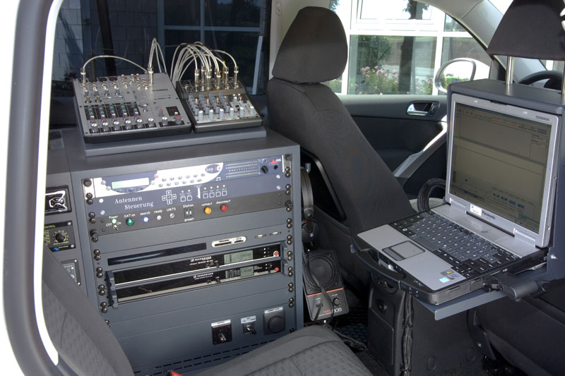 Die Beiträge werden auf einem robusten Laptop (Panasonic Toughbook) aufgezeichnet, das über USB direkt mit dem Tonmischpult MW8cx von Yamaha verbunden wird. Zum Toughbook nimmt über einen USB-2.0-Hub weitere Peripherie Kontakt auf: ein DVB-T-Receiver, ein FlashMic von HHB, ein USB-Card-Reader und ein USB-ISDN-Modem.