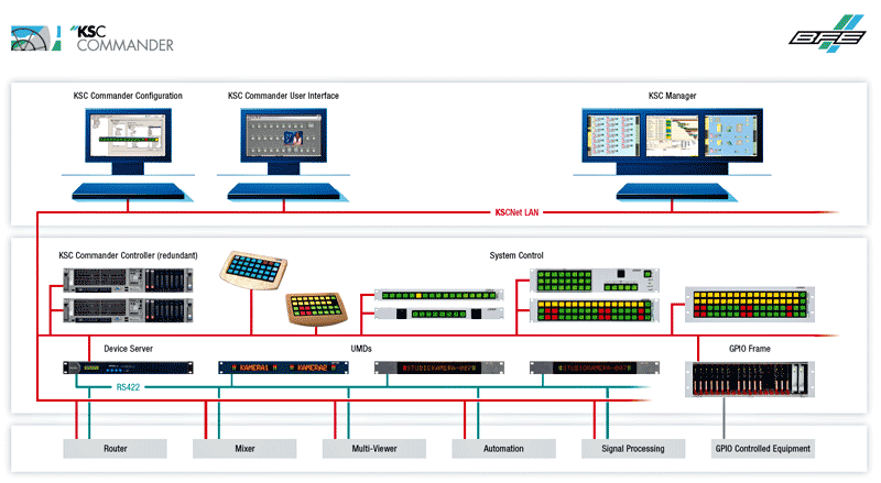 KSC-Commander ist ein Kreuzschienen- und Signal-Steuerungssystem, das von BFE als Nachfolger des KSC-9000-Controller-Systems entwickelt wurde. Zentrale Aufgabe ist die Steuerung aller Video-, Audio- und Remote-Kreuzschienen sowie die damit verbundene Signal- und Funktionsüberwachung. So können unterschiedlichste Geräte von Drittanbietern in eine gemeinsame Bedienoberfläche integriert werden.