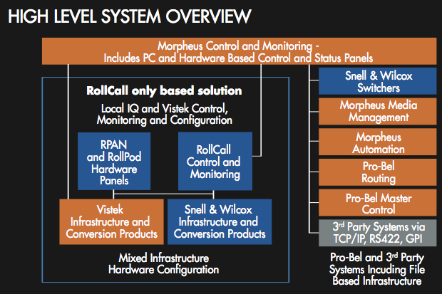 Beim Thema Protokolle und Integration auf der Steuerungsseite verweisen Pro-Bel und Snell & Wilcox zudem darauf, dass es hier schon vor der Fusion erste gemeinsame Projekte gab. So lassen sich die Mischer der Kahuna-Baureihe mit den Sirius-Kreuzschienen nicht nur auf der Signal-, sondern auch auf der Steuerungsebene verknüpfen. Ein Team aus Ingenieuren beider Ausgangsunternehmen soll nach Firmenangaben ab sofort die Integration und Verknüpfung zwischen den Produktlinien auf allen Ebenen weiter vorantreiben, die Priorität soll dabei zunächst auf Vistek und IQ liegen. Ziel soll dabei die Migration auf ein zukünftiges Steuerungs- und Monitoring-System auf der Basis der Pro-Bel-Entwicklung Morpheus sein, das dann mit allen Modular-Bausteinen des Unternehmens funktioniert. Schon jetzt gibt es aber Brücken in der Steuerung der Modular-Produkte.