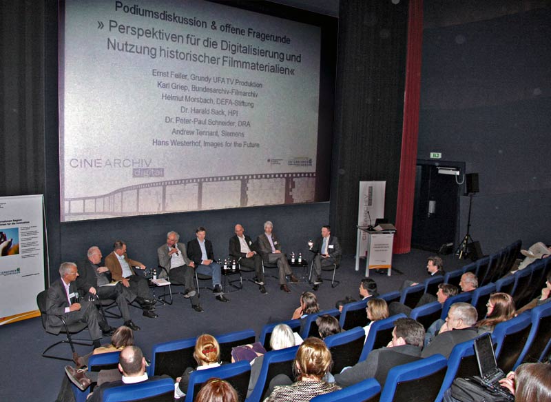 Unter dem Dach von Cinearchiv Digital arbeiten unter anderem die DEFA-Stiftung, das Bundesarchiv-Filmarchiv, das Deutsche Rundfunkarchiv, das Hasso Plattner Institut und Grundy Ufa zusammen. Das Ziel fasste Peter-Paul Schneider, Leiter des Deutschen Rundfunkarchivs in Babelsberg so zusammen: Die Film- und Fernseharchive sollen vom »Aufhebe- und Abrufort« zum »Erlebnisraum für das kulturelle Gedächtnis« werden. »Archive müssen in der digitalen Medienwelt sagen, was geht — nicht, was nicht geht.« Um den Weg zum »offenen Archiv« zu bewältigen, fordert Schneider die Archivinhaber auf, sich Verbündete suchen. Diese waren bei der Veranstaltung in Potsdam zumindest teilweise präsent: Neben Archivaren, Produzenten und Förderern füllten Datenbank- und IT-Spezialisten die Reihen im Kinosaal des FX Centers.