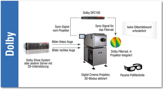 Für das Stereo-3D-Verfahren von Dolby wird in der Regel nur ein Projektor verwendet. Durch ein rotierendes Farbfilter-Rad im Strahlengang des Projektors wird die Wellenlage der RGB-Primärfarben für das linke und rechte Auge gegeneinander verschoben. Über die Interferenz-Filtergläser in den Stereobrillen der Zuschauer wird dann jedes Auge nur mit dem jeweils passenden Bild versorgt. Bei den aktuellen Kinoton-Projekten kamen zwei Projektoren zum Einsatz, um den Helligkeitsverlust auf der großen Leinwand auszugleichen.