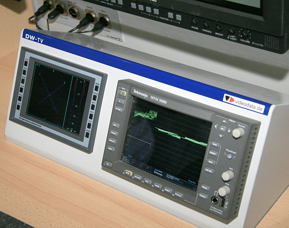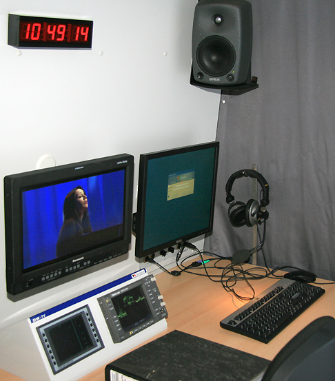 Rechts neben dem Editor schließt sich der Arbeitsplatz für den Redakteur an: Hier kann ein Headset mit Kopfhörer und Mikrofon für die Nachvertonung angeschlossen werden. Auf dem Video-Monitor kann der Redakteur den Beitrag sehen, den er kommentieren will und über ein Plug-In des Media Composers lässt sich der Timecode einblenden. Für die Pegelkontrolle steht ein RTW-Peakmeter zur Verfügung. Die ankommenden und abgehenden Bildsignale wiederum lassen sich über einen Splitscreen-Monitor von TV Logic überwachen, der seine Signale von der Harris-Kreuzschiene erhält. »Für die Signalkontrolle haben wir den Tektronix WFM 5000 eingebaut«, ergänzt Peter Burkert.