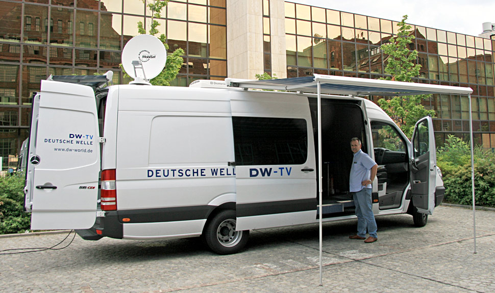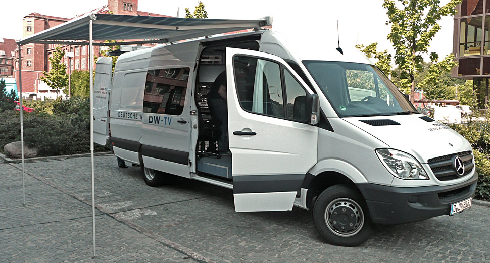Die Deutsche Welle hat ein neues Schnittmobil in Betrieb genommen. Das Fahrzeug wurde zunächst europaweit ausgeschrieben und dann vom Kieler Spezialfahrzeuganbieter Car+Camper als Generalunternehmer zusammen mit den Videospezialisten von Video Data aus Hamburg realisiert. Basis des Fahrzeugs ist ein Mercedes Sprinter 515 CDI.