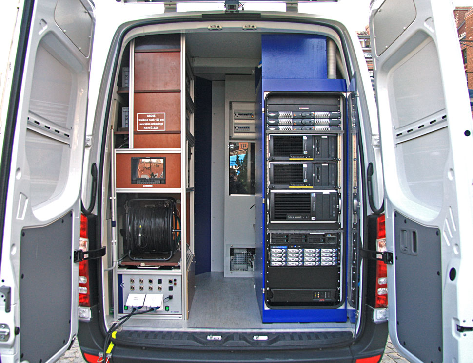 Zusätzlich im Heck untergebracht: Ein 19-Zoll-Rack mit eigener Klimatisierung, in dem die gesamte Avid-Hardware, MediaNet 5.0, die HP-Rechner, die Kreuzschiene (Panacea von Harris) und ein USV-System montiert sind. Das Heck bietet zudem noch Stauraum für Kabel und Kleinteile, zudem ist hier auch ein Camcorder (PDW-700 von Sony) untergebracht, der es dem Editing-Team in Ausnahmesituationen auch erlaubt, eigene Aufnahmen zu machen.