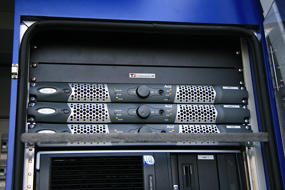 Drei Media Composer sind in das Schnittmobil eingebaut, von denen zwei dazu dienen, ankommende Signale aufzuzeichnen oder auszuspielen und der dritte als Produktionssystem für den Schnitt genutzt wird. Alle sind als vollwertige Editing-Systeme ausgeführt, so dass selbst beim Komplettausfall eines Systems immer noch weitergearbeitet werden kann – wenn auch mit auf einen Ingest-Kanal reduzierter Funktionalität.