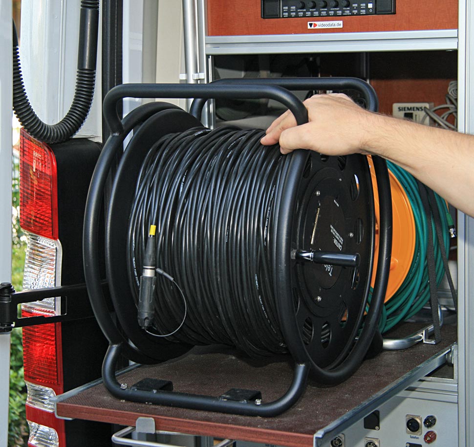 Ein Viper-II-System von Telecast erlaubt es, über Strecken von bis zu 300 m vier Signale (2 x In, 2 x Out) gleichzeitig verlustfrei per Glasfaser ans Fahrzeug heran oder davon weg zu führen. Die passende Glasfaserleitung ist auf einer Kabeltrommel im Heck an Bord. Für kürzere Strecken können SDI-Signale per BNC-Kabel verteilt werden (2 x In, 3 x Out). Außerdem in die Heck-Anschlussbox integriert: ein Telefon/DSL-Anschluss.
