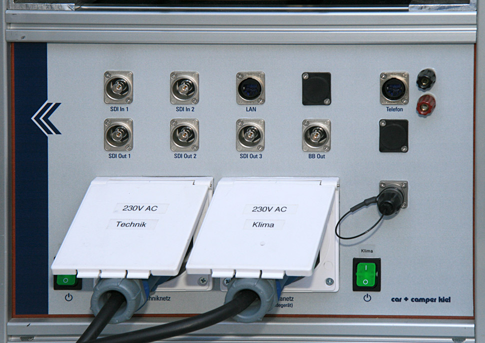 Ohne externen Strom läuft im DW-TV-Schnittmobil gar nichts. Bei einer Unterbrechung dieser Stromversorgung wird die Videotechnik von einer eingebauten USV für weitere fünf Minuten mit Spannung versorgt, um speichern und die Systeme kontrolliert herunterfahren zu können.