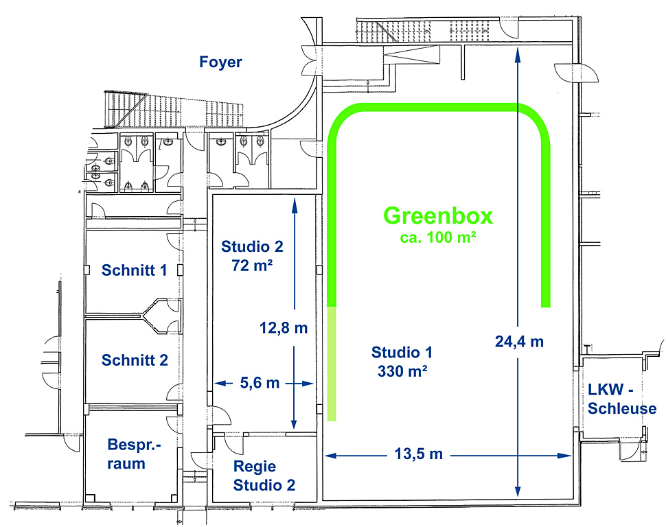 Das größere der beiden Studios wurde jetzt mit einem neuen Spezialboden für Greenbox-Aufnahmen ausgestattet und die Grundfläche der Greenbox auf 100 qm erweitert. Da der Boden aus einzelnen Bahnen besteht, und die Hohlkehle aus einzelnen Elementen, kann anstatt einer Greenbox mit den Maßen 8 x 12 m auch eine langgestreckte Greenscreen-Spielfläche über die gesamte Studiolänge aufgebaut werden. Das Studio ist weiterhin flexibel nutzbar und kann innerhalb einer Stunde vom klassischen TV-Studio zur Greenbox umgebaut werden und umgekehrt.