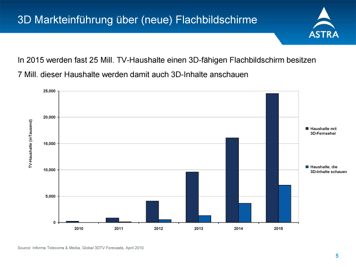 Astra geht für 2015 von europaweit 25 Millionen Stereo-3D-Haushalten aus, von denen aber nur 7 Millionen die Möglichkeiten der Geräte auch ausnutzen.