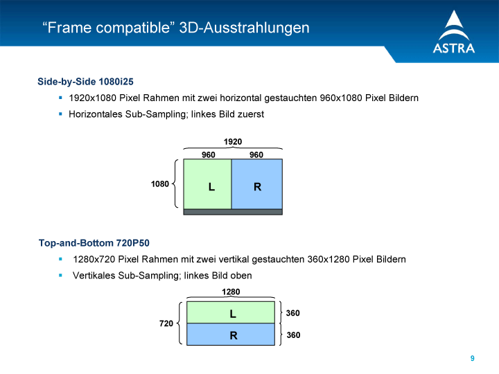 Dann vielleicht doch lieber zurück zum Fernsehen: In Europa preschten bisher lediglich die Pay-Sender BSkyB, Canal+ und Sky Deutschland vor. Auch das unterscheidet Stereo-3D vom HDTV-Start: Bei HDTV hatten sich öffentlich-rechtliche und private Sender an der Sendestandardisierung beteiligt und einen gemeinsamen Nenner gefunden. Den geplanten 3D-Standard wird dagegen — zumindest vorerst — nur das Pay-TV-Trio sanktionieren, deren schon im Markt befindliche HDTV-Receiver für Stereo-3D in der »Side by Side«-Übertragungsvariante geeignet sind. »Side by Side« presst linkes und rechtes Teilbild nebeneinander in ein HDTV-Signal. Diese Teilbilder bestehen aus 960 x 1.080 Bildpunkten: das ist kein »echtes« HDTV.