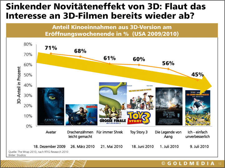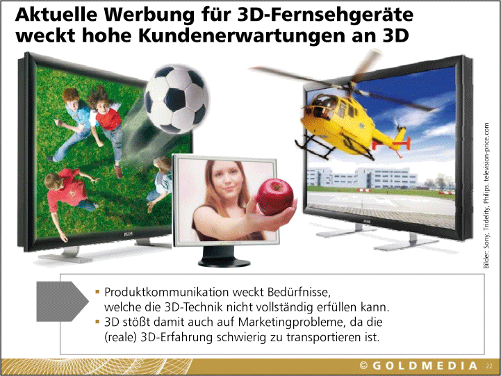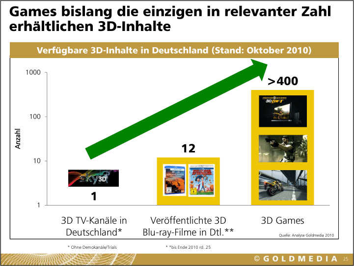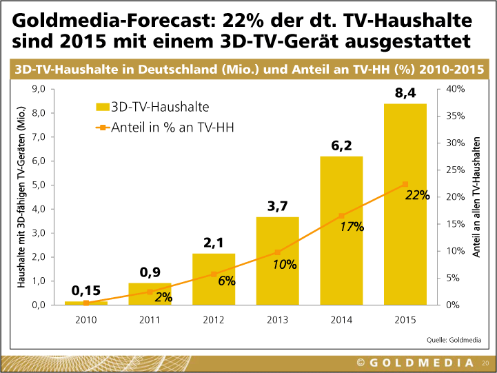 »Auf kleinen mobilen Displays wird 3D zur Erfolgsstory«, prophezeit Klaus Goldhammer von Goldmedia. Für mobile Stereo-3D-Minis, wie von Nintendo angekündigt, reicht wegen der Einnutzer-Situation ein einziger View aus. »Games sind die Content-Innovatoren«, folgert Goldhammer aus dieser Lage und auch daraus, dass es schon 400 3D-Videospiele gibt. 2015 könnten laut Goldmedia 22 % der deutschen TV-Haushalte 3D-taugliche Displays besitzen. Wie stark aber werden sie Stereo-3D tatsächlich nutzen?