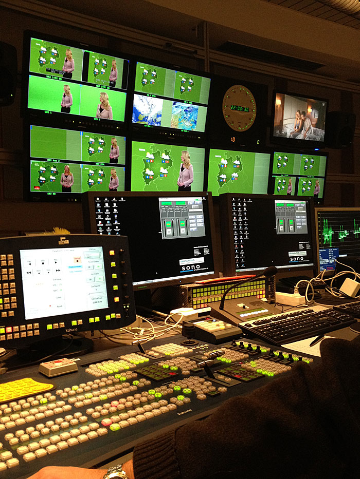In nur knapp zweimonatiger Planungs- und Bauzeit errichtete Sono am Standort Geiselgasteig eine auf die spezifischen Belange der Wetter-Produktion optimierte Regie: Produziert wird mit LDK 8000 Elite Kameras von Grass Valley, einem Snell-Kahuna-Bildmischer in Verbindung mit der Ultimatte HD, einer Nevion HD-Kreuzschiene, Monitoren von TV-Logic, Modular-Equipment von Lynx und einem GVG K2 Solo-Server. Die Grafik-Maschinen von Vizrt wurden ins System eingebunden. Weiter lieferte Sono auch die Regiemöbel und Monitorwände sowie die Audio- und Intercom-Technik.