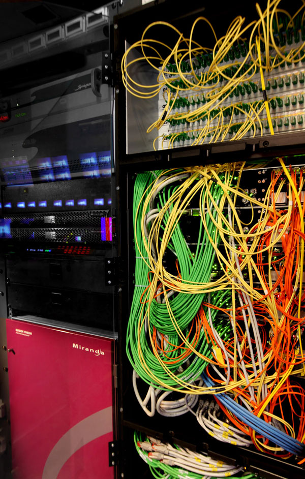 Die Audiokreuzschiene und das Interkom-System sind über MADI an MediorNet angebunden, der Miranda NVision 8208 Router über Koax-Video-Verbindungen. MediorNet ermöglicht laut TVN als vollsynchrones Echtzeit-Netzwerk nicht nur den Signaltransport, sondern auch die Sync-Verteilung über das gesamte Netzwerk inklusive aller Stageboxen. Integrierte Frame-Synchronizer an allen Eingängen ermöglichen es, asynchrone Signale zum Blackburst oder Tri-Level-Referenztakt im System zu synchronisieren. Dabei verfügt MediorNet über ein ausgefeiltes Robust-Sync-Feature: Wird MediorNet auf einen externen Takt synchronisiert, übernimmt MediorNet nahtlos, wenn die Sync-Quelle ausfällt. Steht der externe Takt wieder zur Verfügung, gleicht sich MediorNet schrittweise diesem Takt an und übergibt die Sync-Kontrolle schließlich wieder dem externen Taktgeber. Weitere MediorNet Features wie integriertes Embedding, De-Embedding oder Time-Code Insertion an allen Ein- bzw. Ausgängen erübrigen weitere externe Geräte, die normalerweise für diese Aufgaben benötigt werden würden.