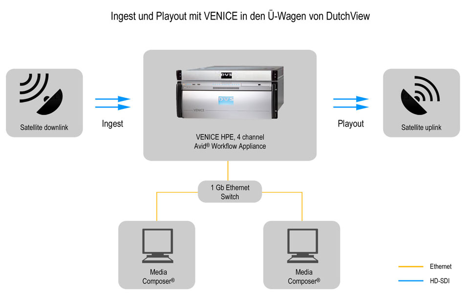 In DutchViews Übertragungswagen zeichnet Venice die eingehenden Live-Signale über HD-SDI auf. Alle Ströme werden mit Venice gespeichert. Da Venice mit seiner Avid-Workflow-Option das direkte Zusammenspiel mit Avid Media Composer unterstützt, können die Editoren sofort an sämtlichen angebundenen Arbeitsplätzen auf das gesamte Material zugreifen. Dank der »Edit while Ingest«-Funktion in Venice lässt sich das Material bereits während der Aufzeichnung sichten und bearbeiten, was Zeit spart. Venice erlaubt nicht nur Live-Video-Ingest über HD-SDI, sondern ermöglicht es auch, Files von P2- oder XDCAM-Speichermedien zu übermitteln. Editierte Sequenzen können direkt auf Venice transferiert und anschließend in die Produktionskette übertragen werden. Für den anschließenden Playout des bearbeiteten Materials ist kein weiteres Equipment nötig. Venice unterstützt eine Vielzahl von Codecs (unter anderem Avid DNxHD, Apple ProRes 422 oder Panasonic AVC-Ultra) und bietet den Anwendern bei ParkPost viel Flexibilität in der Organisation ihrer Workflows.