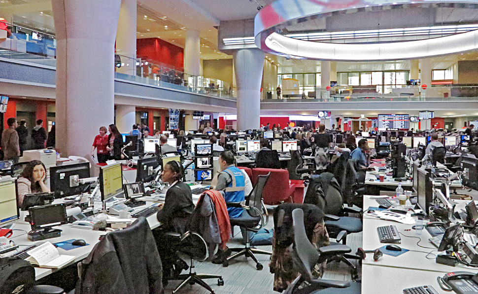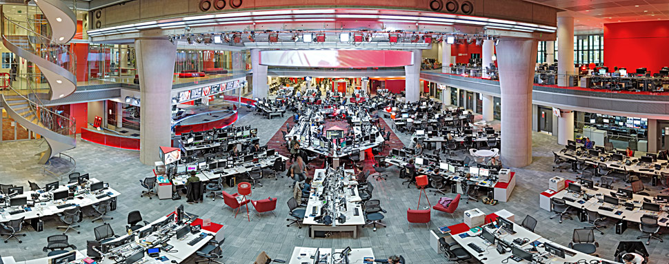 Herzstück des neuen East Wings ist ohne Zweifel der Newsroom: Hier wird im 24-Stunden-Schichtbetrieb an rund 300 Journalisten-Arbeitsplätzen redaktionell gearbeitet. Der Newsroom bedient unterschiedlichste Kanäle und Distributionsformate — und der Output wird an rund 350 Millionen Haushalte weltweit distribuiert.
