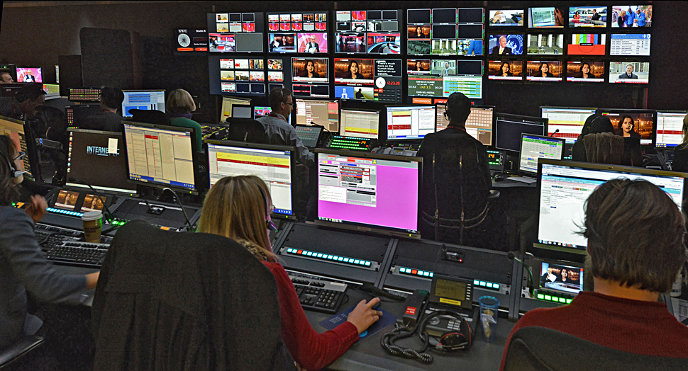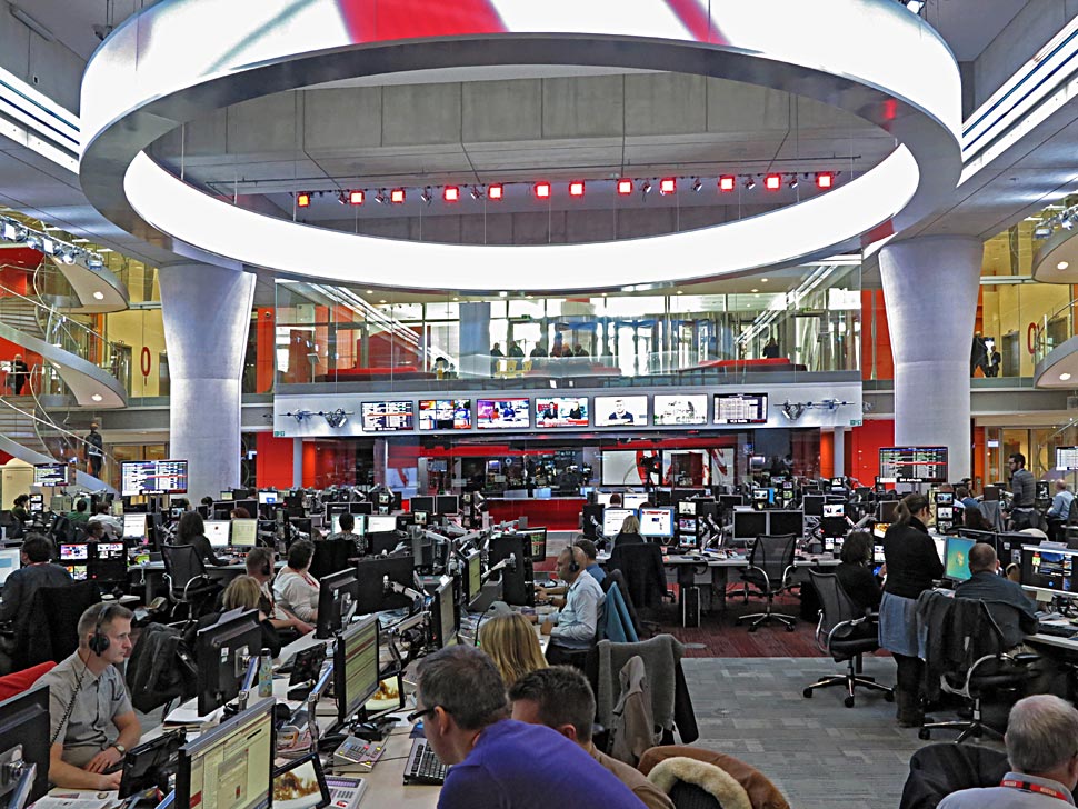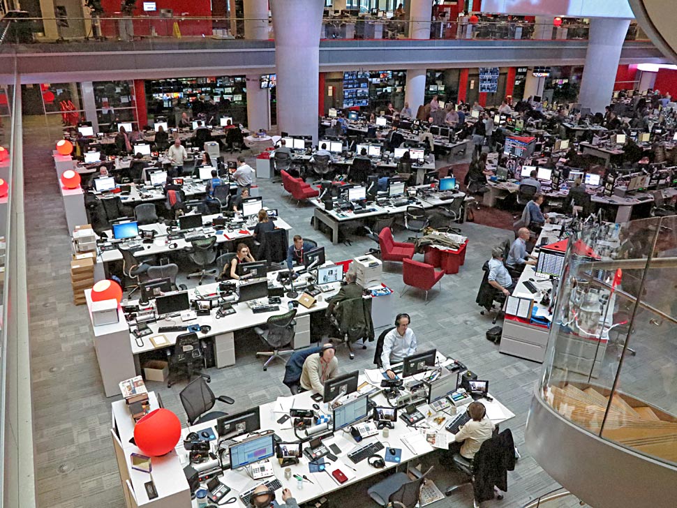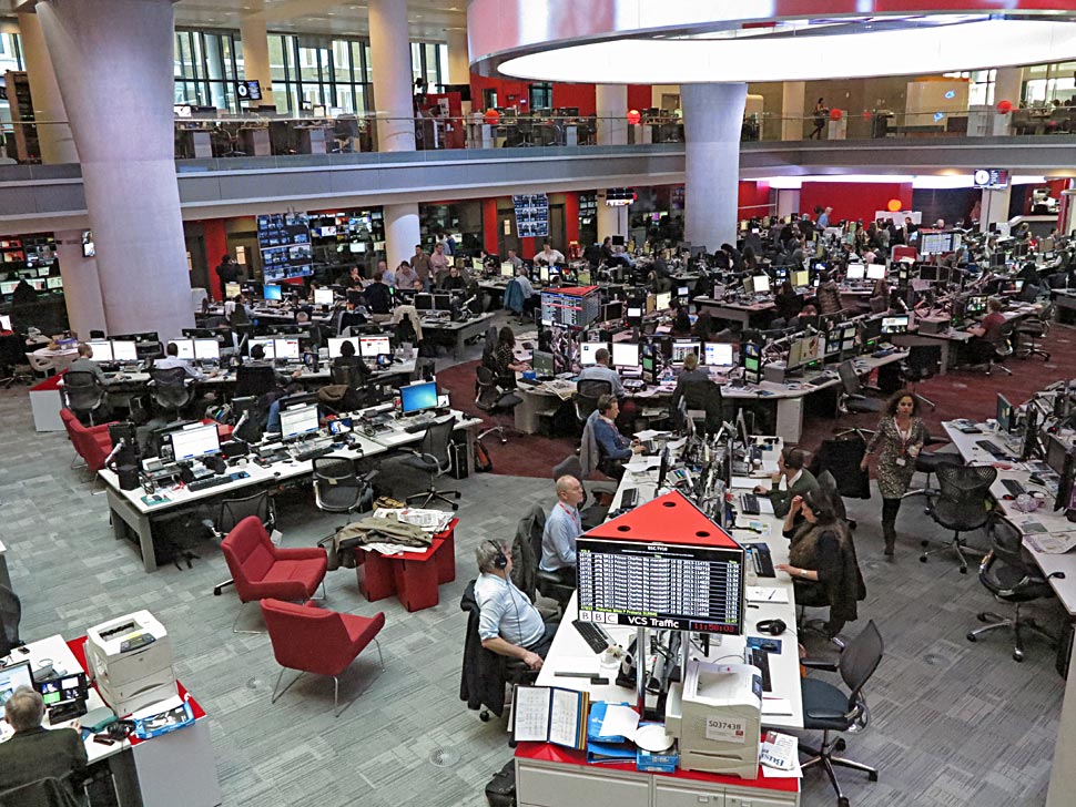 Die Journalisten kommunizieren von hier aus mit Korrespondenten und Reportern, sie wählen Meldungen der Nachrichtenagenturen aus, bewerten, analysieren die Nachrichtenlage, texten und erstellen Beiträge für die nationalen und internationalen Programme der BBC — und sie alle bedienen die Plattformen Radio, TV und Online.