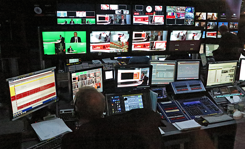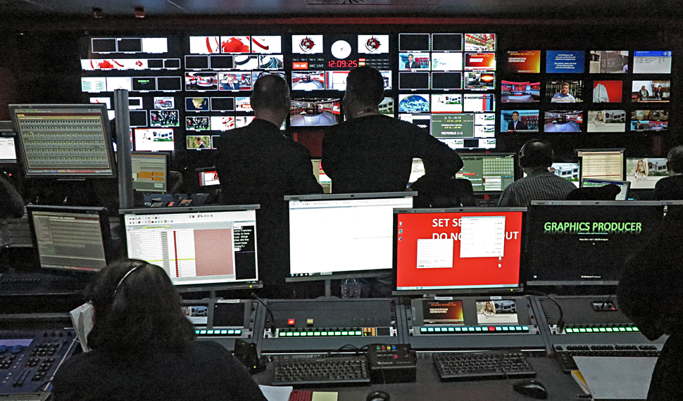 Rund um die Arbeitsplätze im Newsroom sind drei Studioregien angeordnet. Von hier aus wird das Studio-Equipment dirigiert: Kameras, Licht, Ton, Bildschirme — unterstützt durch das Automationssystem Mosart.