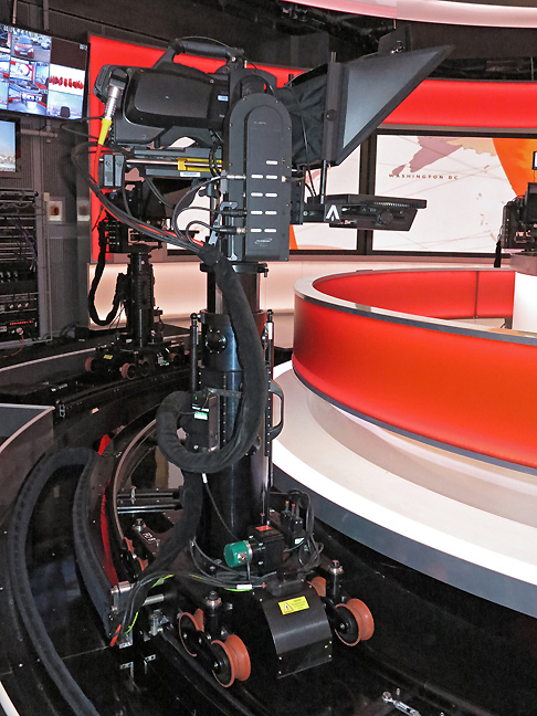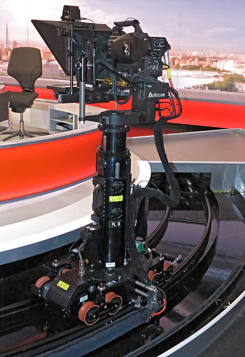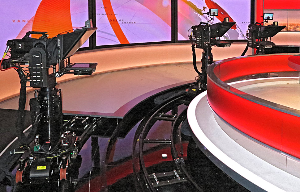 Studio C ist voll automatisiert. Hier sind sechs Furio-Roboter-Kameras von Ross Video im Einsatz, fünf davon sind auf Schienen unterwegs, sodass sich sehr dynamische Sendungen mit vielen bewegten Kameraeinstellungen realisieren lassen. »Aufgrund der bewegten Kameraführung wirken die Programme aus diesem Studio sehr energiegeladen und dynamisch«, sagt Mike Kavanagh. In diesem Studio sind drei große Displays eingebaut, auf denen sich Live-Videoquellen mit Interviewpartnern ebenso darstellen lassen, wie Grafiken.