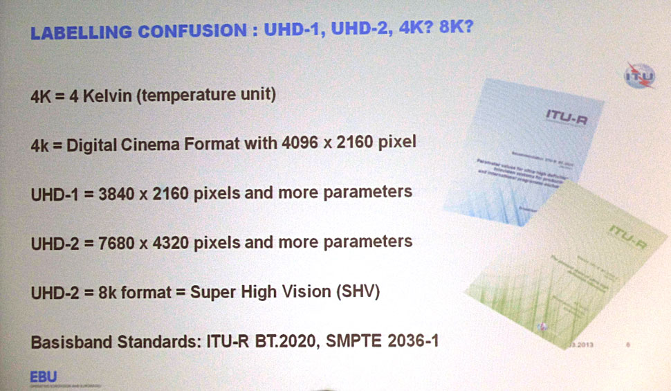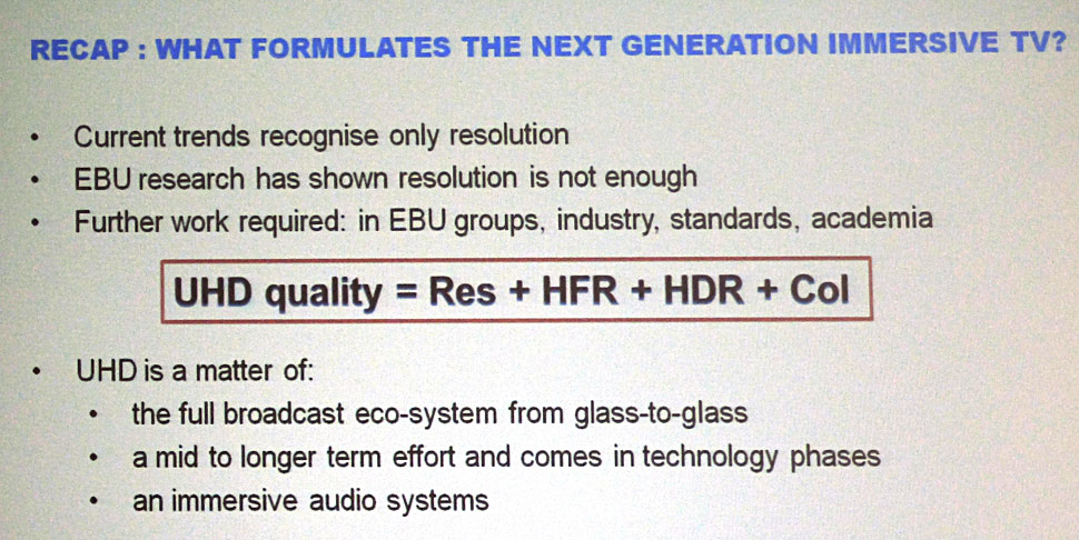 Hoffmann macht einen deutlichen Bedarf aus, die einzelnen Spielarten höherer Auflösung genauer zu definieren und erläuterte Begriffe wie 4k, UHD-1, UHD-2, SHV. Aus seiner Sicht darf Ultra HD auch nicht auf eine höhere Auflösung beschränkt bleiben. So hätten Tests der EBU ergeben, dass Faktoren wie höhere Bildraten (HFR), ein höherer Dynamikumfang (HDR), ein größerer Farbraum und immersives Audio mindestens ebenso wichtig seien und teilweise sogar einen größeren Einfluss auf das Zuschauer-Erlebnis hätten.