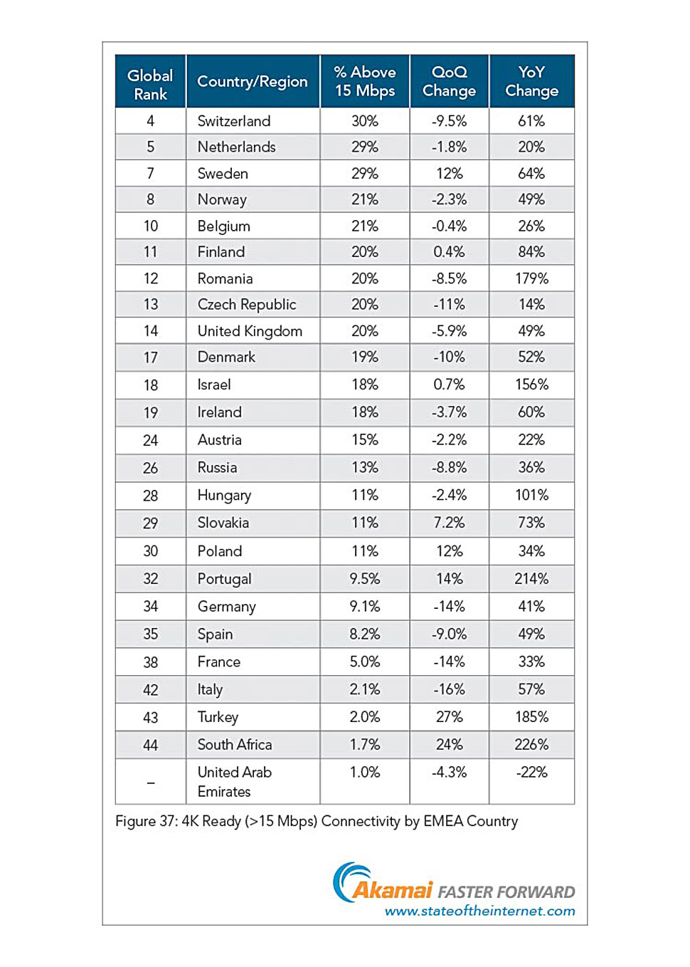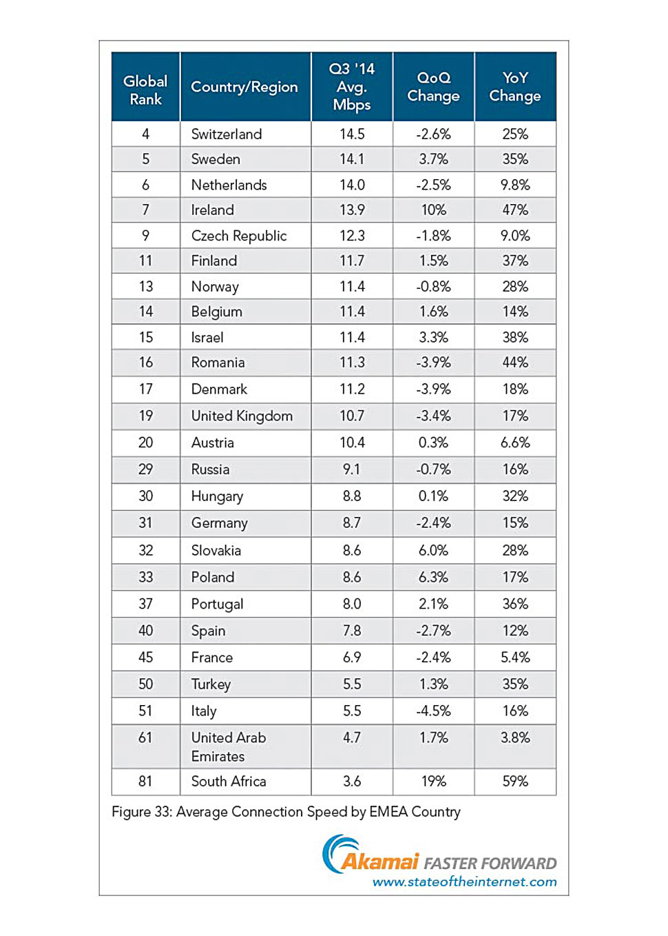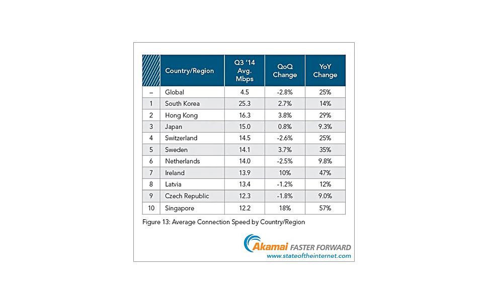 • Die Schweiz führte dabei mit einer durchschnittlichen Verbindungsgeschwindigkeit von 14,5 Mbit/s knapp vor Schweden (14,1 Mbit/s) die europäischen Länder an — bereits das dritte Quartal in Folge. In ganz Europa war im dritten Quartal 2014 ein Wachstum gegenüber dem Vorjahresquartal zu verzeichnen. Das größte Plus erzielte dabei Irland mit 47%, Schlusslicht war Frankreich mit einem Zuwachs von lediglich 5,4%.