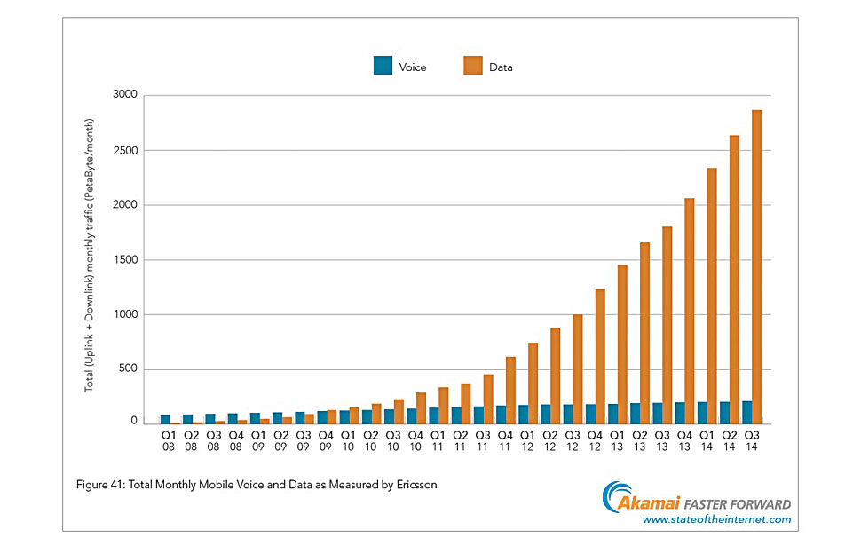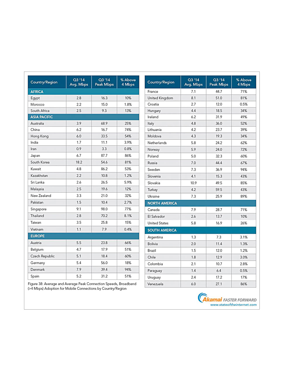 Im State-of-the-Internet-Bericht für das dritte Quartal 2014 wurden von Akamai wieder 54 Länder beziehungsweise Regionen hinsichtlich ihrer Mobilfunknetze untersucht. Das Land mit der höchsten durchschnittlichen mobilen Verbindungsgeschwindigkeit weltweit ist weiterhin Südkorea mit einem erneuten Anstieg von 15,2 Mbit/s auf 18,2 Mbit/s. Weltweites Schlusslicht mit 0,9 Mbit/s ist der Iran. Spitzenreiter in Europa bleibt die Slowakei mit einem Wert von 10,9 Mbit/s.