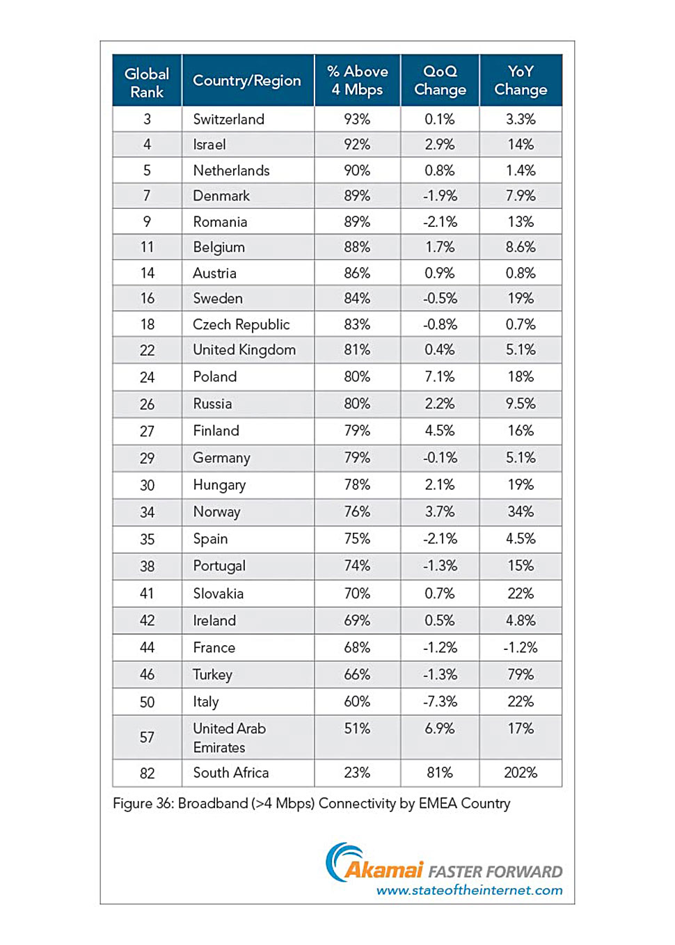 Verbindungen, die schneller als 10 Mbit/s laufen, definiert der Akamai-Report als High-Broadband-Verbindungen. In Deutschland war dies im dritten Quartal 2014 bei nahezu einem Viertel (23%) aller Verbindungen der Fall, was ein Plus von 32% gegenüber dem Vorjahr, Platz 18 in der EMEA- und den letzten Platz in der DACH-Region bedeutet. Österreich kam auf einen High-Broadband-Anteil von 28% (Jahreszuwachs 14%). Beim EMEA- und DACH-Spitzenreiter Schweiz hatte mehr als die Hälfte aller Verbindungen (54%) High-Broadband-Qualität, das entspricht einem Jahresplus von 39%.
