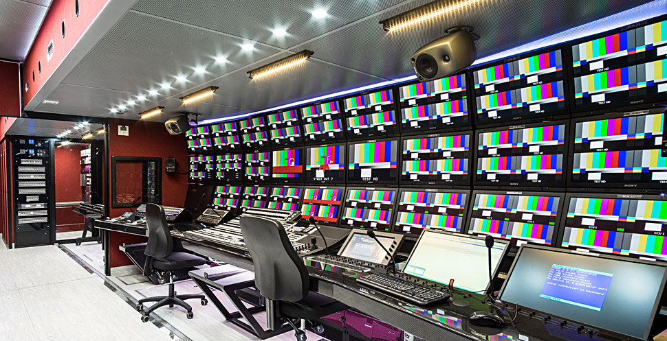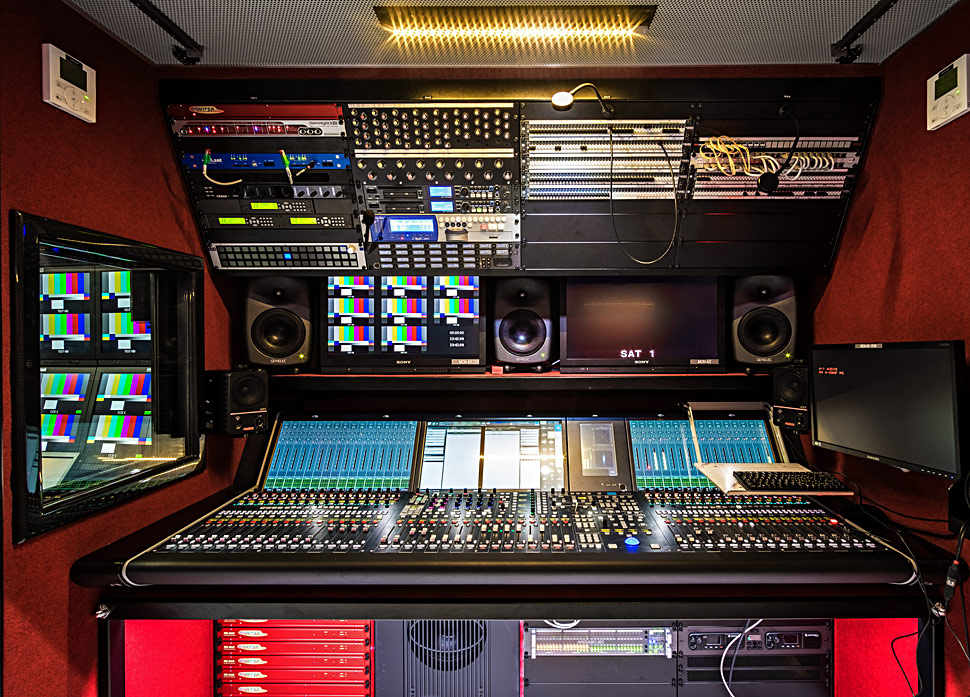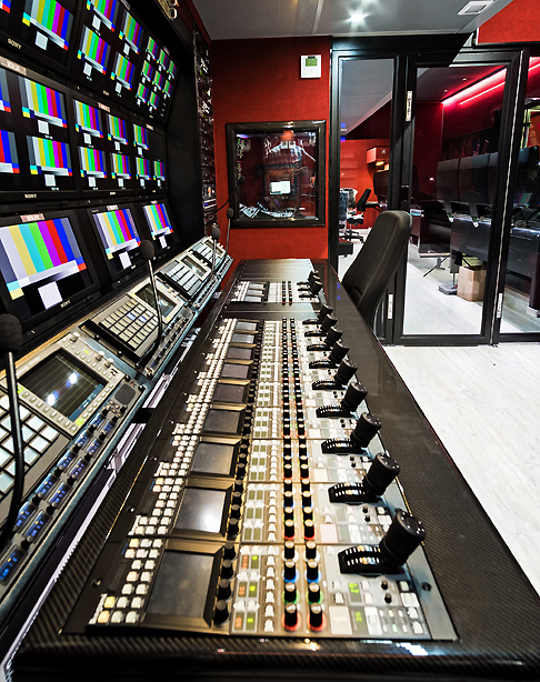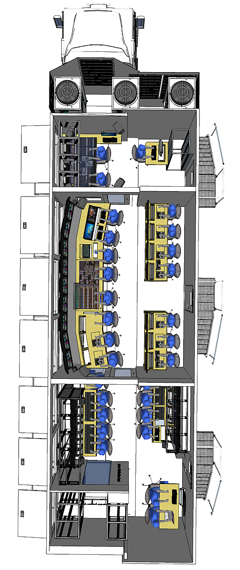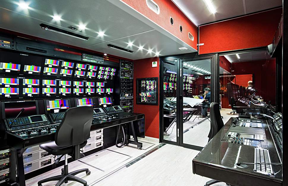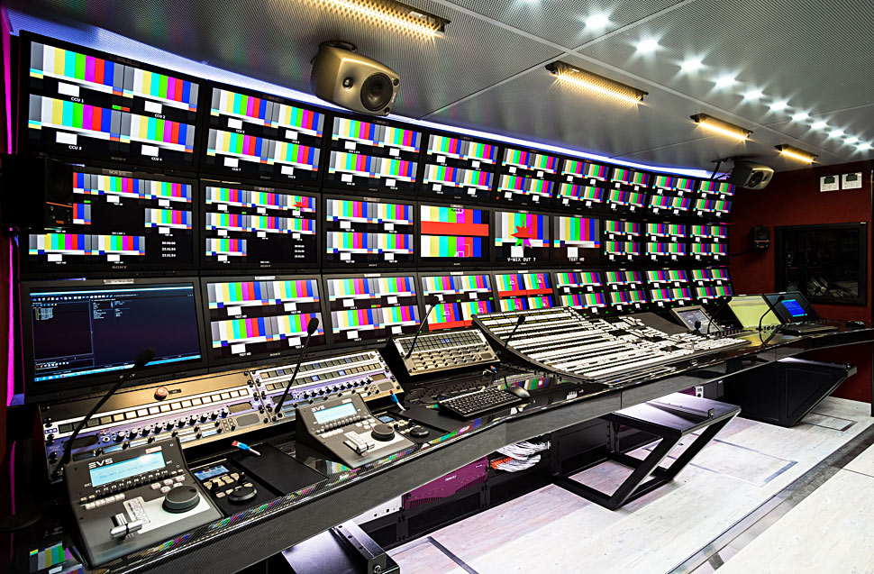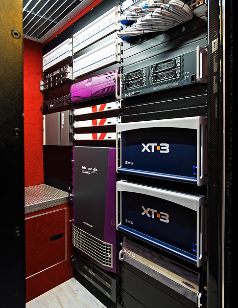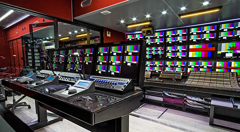 Das Innendesign wurde nach den Wünschen des Kunden individuell gefertigt. Zusätzlich zu elektrisch verschiebbaren, mit Karbon beschichteten Möbeln, wurden weitere Spezialanfertigungen integriert, wie etwa ein eigens angepasster Videomischer des Typs Kayenne von Grass Valley. So wurden individuelle, komfortable und sinnvolle Arbeitsbedingungen für die Operatoren geschaffen.