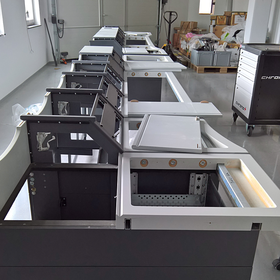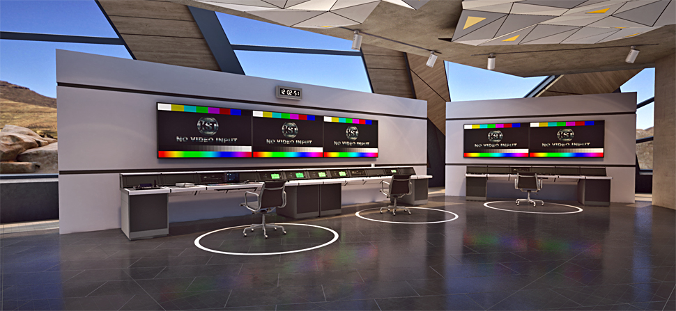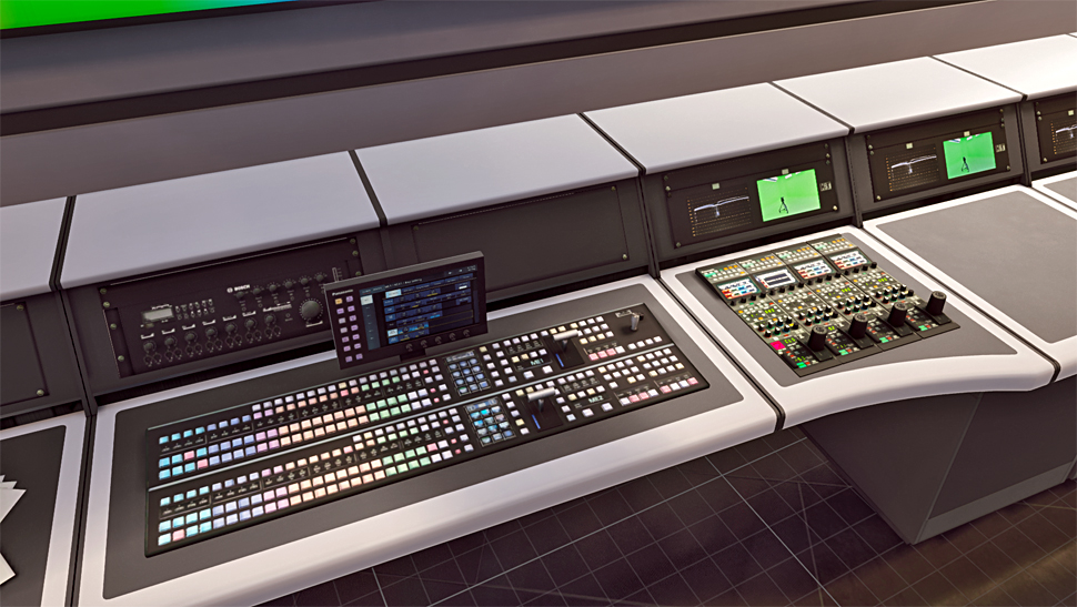 Im Control-Room wurden zwei modulare Studioarbeitstische aus eigener Fertigung von KST mit einer Länge von insgesamt 4,2 m eingebaut. Die Tische sind in vier operative Hauptfunktionsbereiche unterteilt und dort wurden die jeweiligen Bedienteile integriert: Grafik, Ton, Bildtechnik/Mischung und Automatisierung/Robotik. Die Position der jeweils entsprechenden Operator-, Mess- und Monitoring-Einrichtungen sind jeweils dafür optimiert.