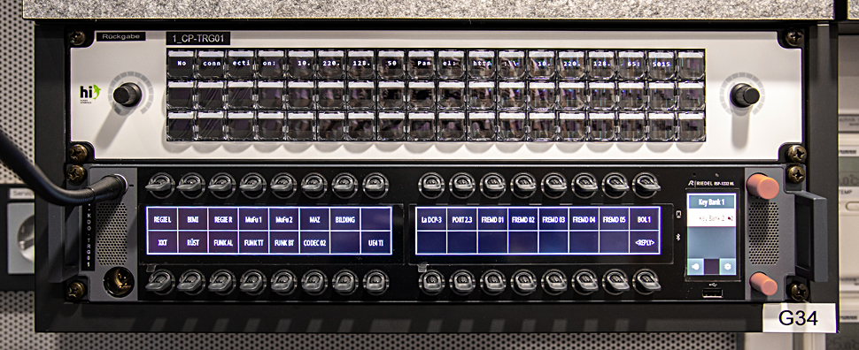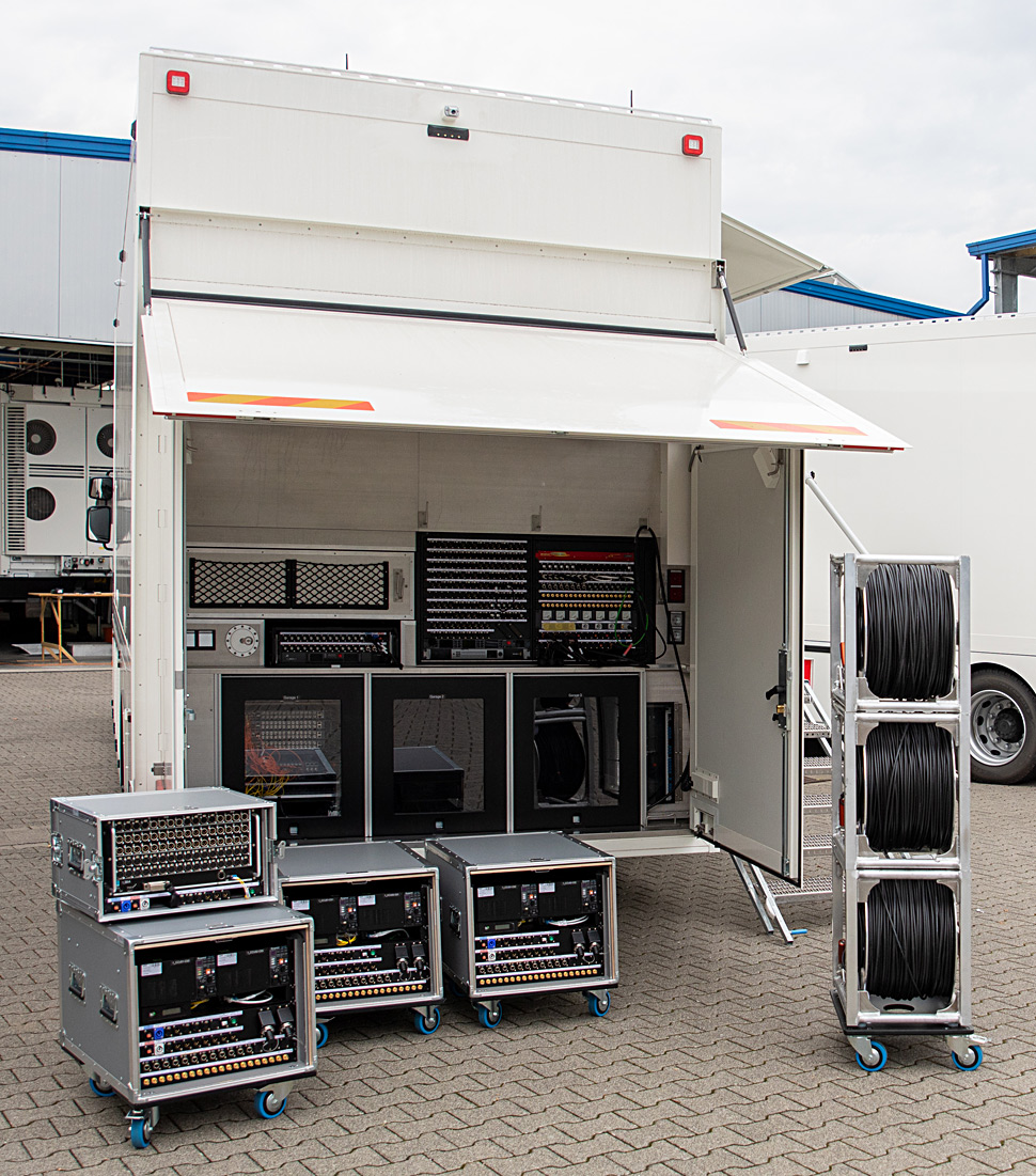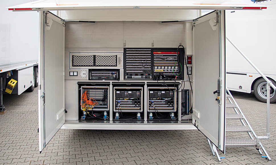 Herzstück des Ü3 ist die dezentrale Riedel MediorNet-UHD-Struktur, die hier in der weltweit ersten Installation zum Einsatz kommt. Im Fahrzeug sind sechs dieser Geräte dezentral verbaut, weitere sieben sind in Stageboxen montiert, die etwa auch die Kamera-CCUs, aber auch alle Audio-, Steuerungs- und IP-Schnittstellen enthalten und sehr flexibel im Set platziert werden können.