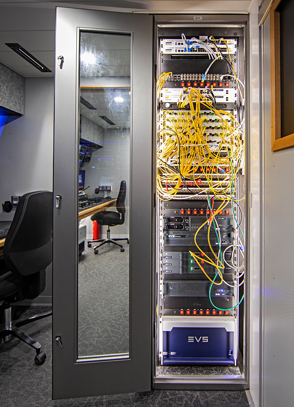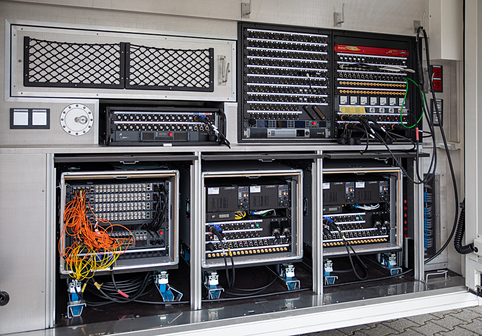 Große Teile der Technik sind, wie schon erwähnt, in den Stageboxen integriert, andere Technikkomponenten sind hingegen klassisch fest im Fahrzeug eingebaut: so etwa Tektronix-Messtechnik, ein Dyvi-Mischer und Slomo-Server von EVS, IP-Bonding-Encoder von LiveU, Streaming-Devices von Matrox und zahlreiche Infrastruktur-Produkte diverser Hersteller.
