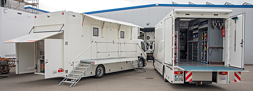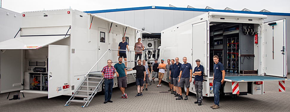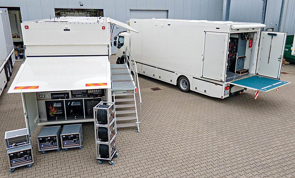 Gebaut hat das Fahrzeug und den Rüstwagen der Systemintegrator Broadcast Solutions. Bei der Planung und Umsetzung wurden viele Überlegungen hinsichtlich der Funktion und Einsatzweise eines TV-Ü-Wagens ganz neu bewertet — auch im Verbund mit Hörfunk-Ü-Wagen des WDR, die ebenfalls von Broadcast Solutions realisiert wurden.