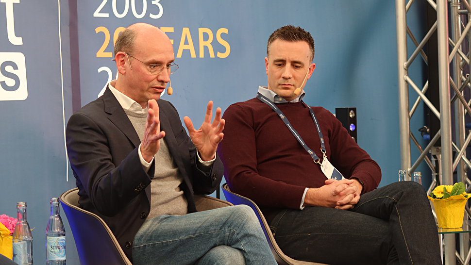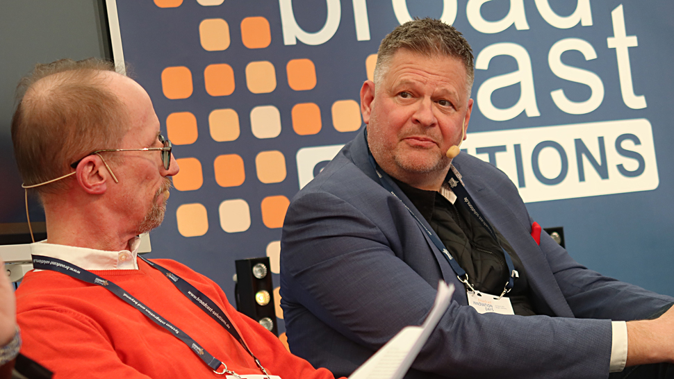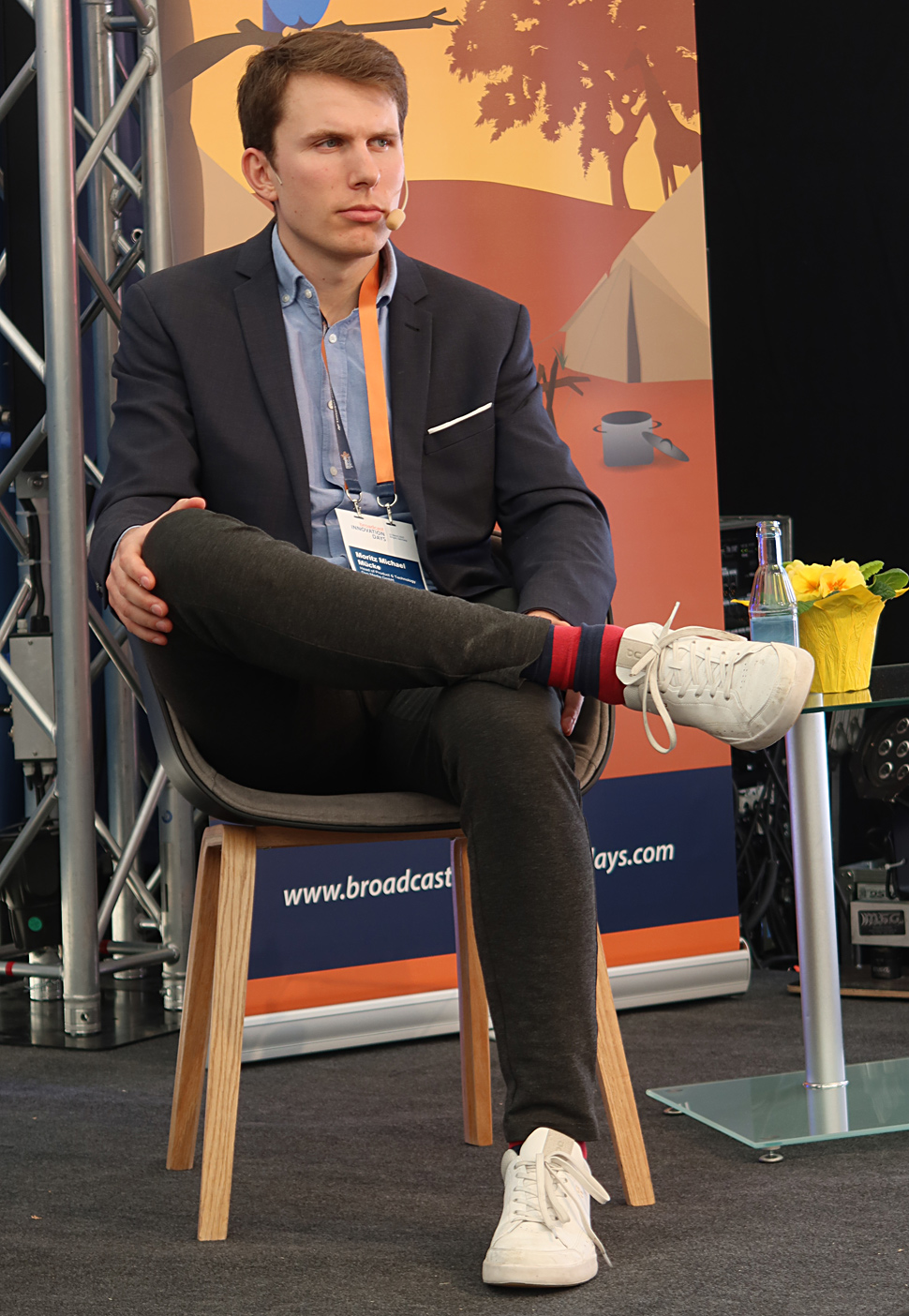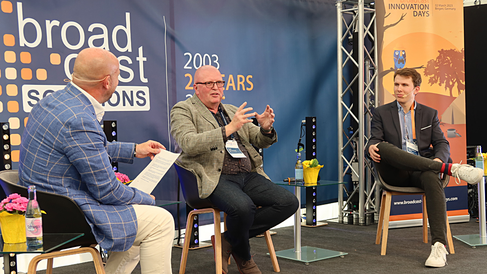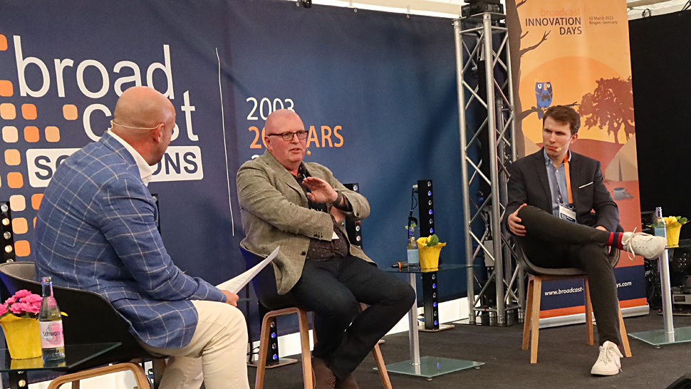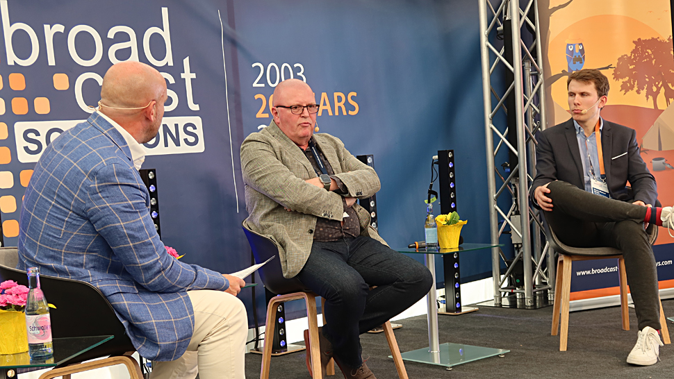 Beim ersten Panel wurden Moritz Mücke, Head of Product and Technology von Dyn Media, und Peter van Dam, CTO von Saudi Sports Channel, durch Moderator Chris Redmond zu ihren Ansichten und Einschätzungen zum Themenbereich Centralized/Cloud-Production-Centers befragt.