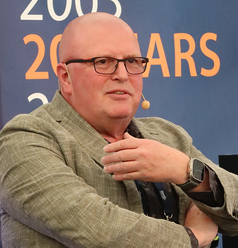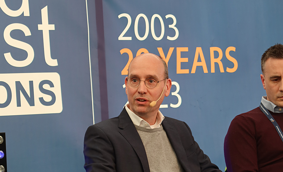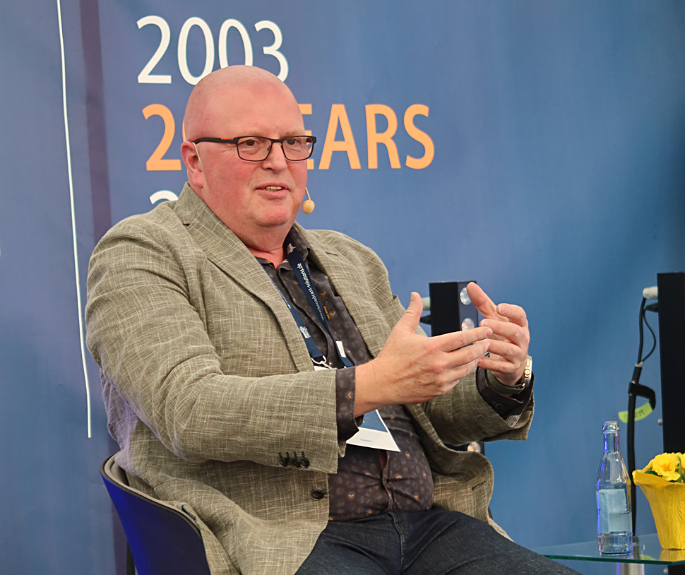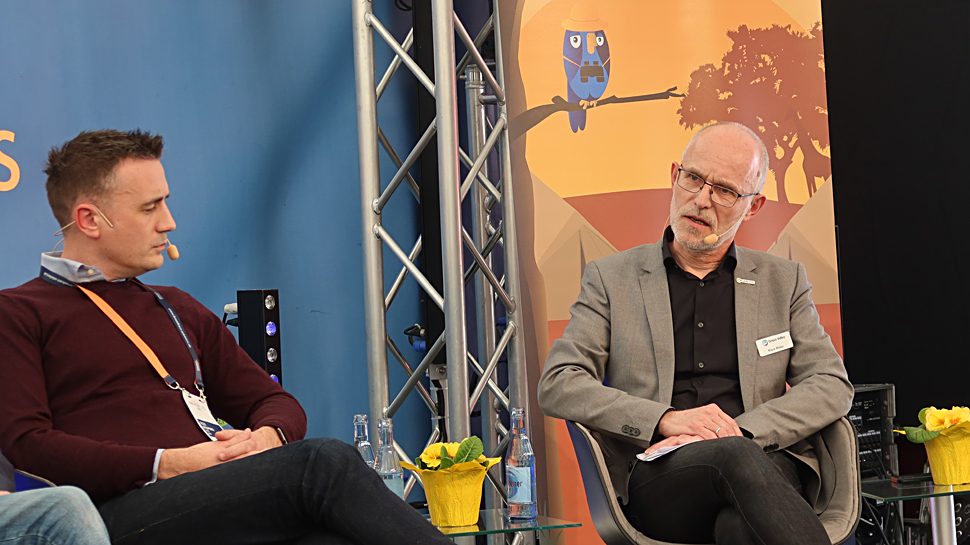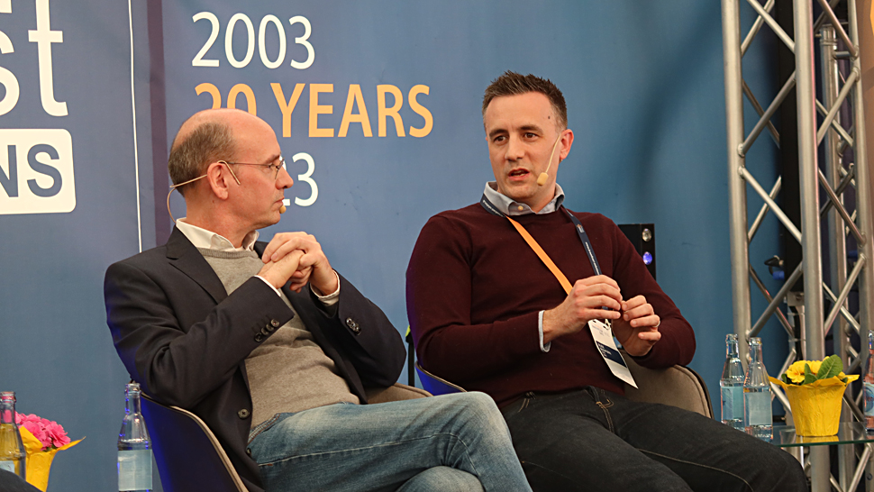 Beim ersten Panel wurden Moritz Mücke, Head of Product and Technology von Dyn Media, und Peter van Dam, CTO von Saudi Sports Channel, durch Moderator Chris Redmond zu ihren Ansichten und Einschätzungen zum Themenbereich Centralized/Cloud-Production-Centers befragt.