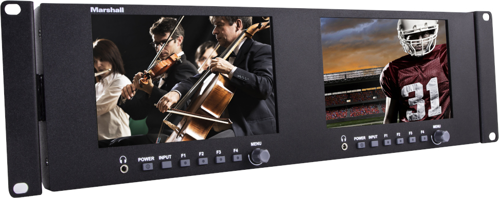 Monitorbrücke mit 3 HE mit zwei 7-Zoll-Displays und HDMI- sowie 3G-SDI-Inputs.
