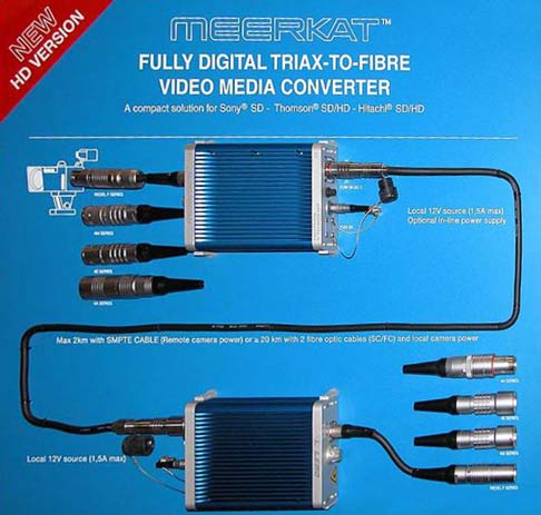 Konverter-Stecker zwischen Triax/HD-SDI und Glasfaser.