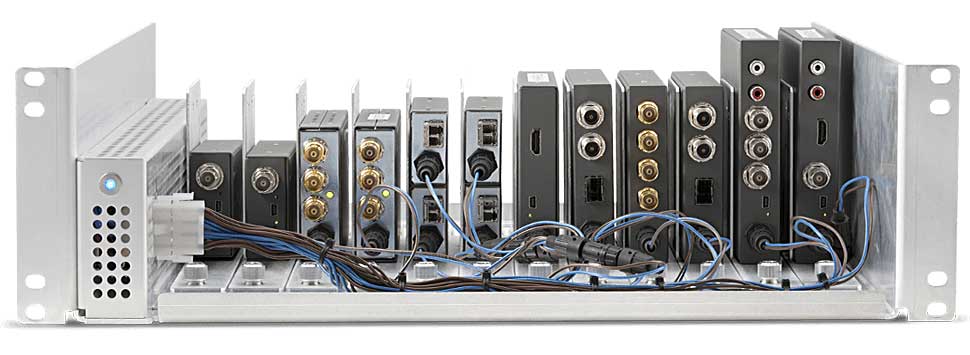 Der neue Geräteträger DRM2 von Aja sorgt für Spannungsversorgung und Ordnung, wenn Mini-Konverter in…