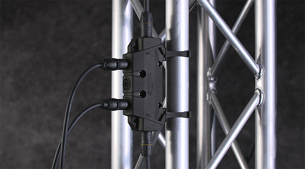 Robuster Stromverteiler von Klotz für PowerCon-True1-Steckverbindungen.