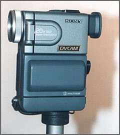 Außer dem dunkelgrauen Gehäuse fällt beim DSR-PD1 zunächst nur der serienmäßig beiliegende, dickere Akku als Unterschied zum Consumer-Modell auf. Den gravierendsten Unterschied des DSR-PD1 zu seinem Consumer-Bruder DCR-PC7 symbolisiert ein goldglänzender Schriftzug: Der DSR-PD1 schreibt die digitalen Daten im gegenüber DV leicht modifizierten DVCAM-Format aufs Band.