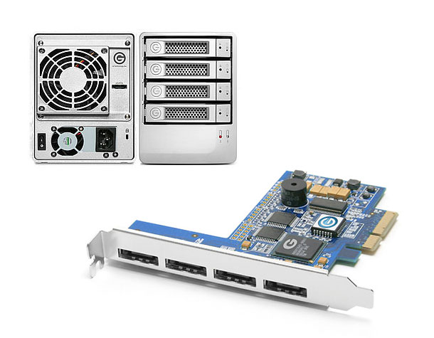 G-Speed eS nutzt vier Hitachi-Laufwerke (7200 Umdrehungen) und bietet eine 3-Gbps-eSATA-Schnittstelle. Es ist in vier Versionen mit Speicherkapazitäten von 1 bis 4 TB erhältlich. Ein optionaler RAID-Controller (PCIe) ermöglicht die RAID-Levels 0, 1, 5, 10 und soll damit eine individuell konfigurierbare Kombination aus Datensicherheit und Performance bieten. Das Besondere dabei: Es können bis zu vier Laufwerke mit 16 Platten wie ein einziges gemeinsames Laufwerk angesprochen werden — die 2-TB-Schallmauer für Laufwerke unter Windows ist damit Vergangenheit. Festplatten und Lüfter sind beim G-Speed eS im laufenden Betrieb austauschbar. G-Speed eS sieht der Hersteller als optimalen Partner für Videoschnittsysteme auf Basis von Blackmagic, Aja und