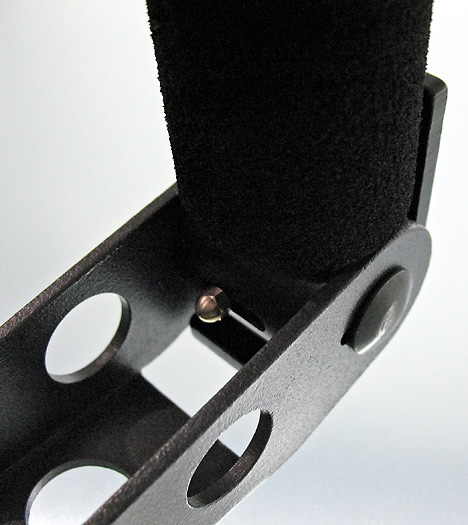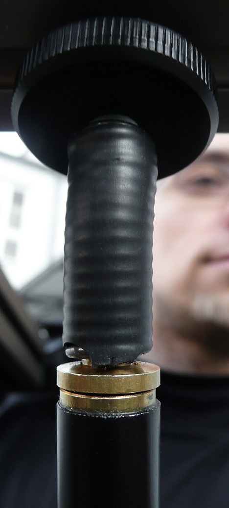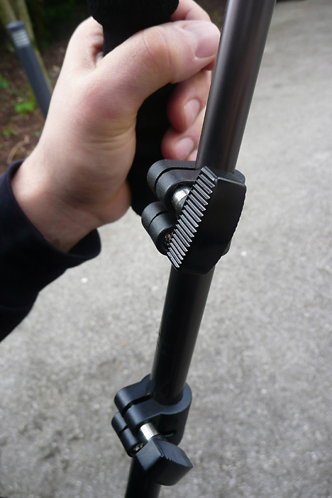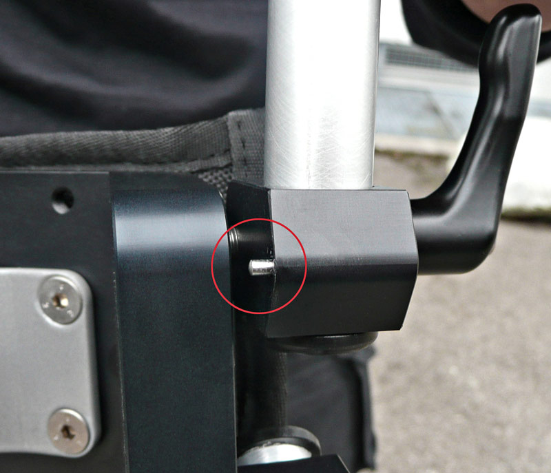 Die Stangen, an denen die Haltegriffe angebracht sind, werden mittels kleiner Metallstifte und eines Schraubverschlusses an einer der Raststufen fixiert. Allerdings muss man bei der Handhabung der kleinen Metallstifte vorsichtig sein, da diese nicht automatisch einrasten und zudem leicht abbrechen können. In der Hektik einer Produktion ist das wohl eine der ersten Bruchstellen der ABC-Schulterstütze.