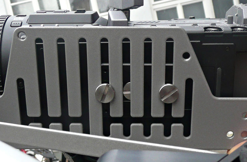 Der Camcorder wird auf einem Stativschlitten montiert. Leider ist die Flügelschraube für viele Camcorder-Modelle, wie etwa auch den Panasonic DVX100, zu kurz und greift erst gar nicht. Hier musste im Test eine normalen Stativschraube eingesetzt werden. Der Schlitten wird dann mit einer Stoppnoppe aufgesetzt und kann schließlich in verschiedenen Position festgeschraubt werden. Der Camcorder kann nach links und rechts verschoben werden, die Distanz zum Kameramann ist über die Wechselplatte variabel. Hier bietet auch die Positionierung der Hüftstütze und die Neigung der Schulterstütze Einstellmöglichkeiten.