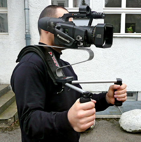 Viele Kameraleute finden das Drehen mit Schultercamcordern wesentlich angenehmer als mit Handhelds, obwohl der Camcorder selbst dabei meist deutlich mehr wiegt: Die Schulter trägt die Hauptlast und der Kraftaufwand verteilt sich auf die gesamte Rumpfmuskulatur. Da liegt es nahe, auch beim Drehen mit Handhelds das Gewicht von den Armen auf andere Körperteile zu verteilen, den Camcorder also auf die eine oder Weise am Körper abzustützen. Ein weiterer Aspekt dabei: bandlose Camcorder sind meist eher frontlastig, weil dem schweren Objektiv kein schweres Laufwerk am anderen Ende des Camcorders mehr entgegensteht.