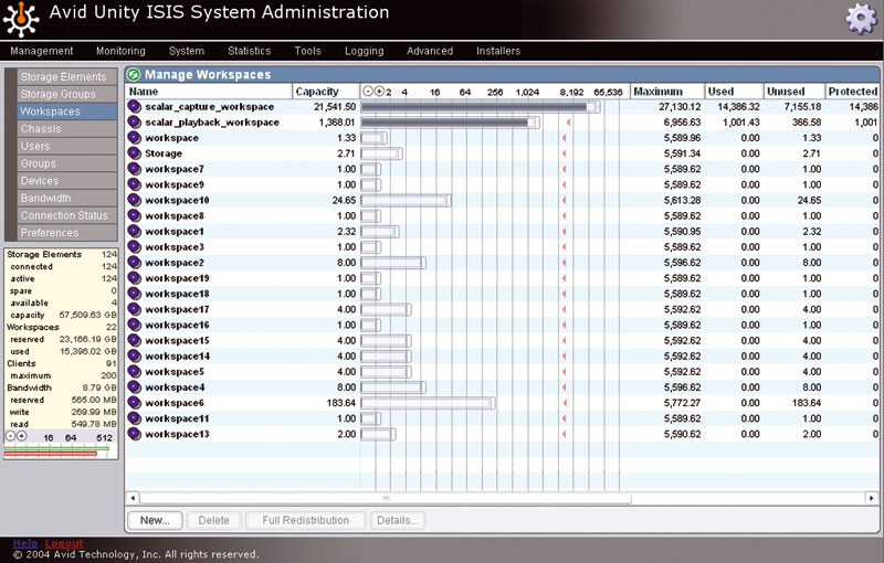 • Das System bietet einen 10 GBps-Ethernet Client, der Auflösungen bis zu unkomprimiertem HD und 2K unterstützt. Isis leistet bis zu 400 MB/s, bei Zusammenschluss von maximal 12 Engines erreicht man 4.800 MB/s oder insgesamt 32 Streams unkomprimiertes HD oder 240 Streams komprimiertes HD.