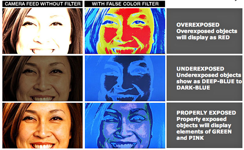 Eine Besonderheit des Marshall-Monitors ist der False Color Filter, der es mit Hilfe von farbigen Darstellungen ermöglicht, über- oder unterbelichtete Parts eines Bildes leichter zu identifizieren.