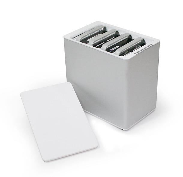 LMP Computer, Tochterfirma des Schweizer Mac-Zubehör Spezialisten LMP, stellt mit dem neuen LMP DataTower ein etwas anderes RAID-Gehäuse vor. Von den klassischen RAID-Gehäusen mit horizontalen Festplatteneinschüben unterscheidet sich der DataTower durch sein Top-Loader-Design. Unter einem großen Deckel auf der Oberseite sind die Festplatten vertikal im Geäuse untergebracht. Ein SmartGuider-Haltebügel ersetzt laut Hersteller unnötig komplizierte Wechselrahmen. So soll der Wechsel der Festplatten erleichtert werden, wobei die Platten aber absolut sicher im Gehäuse untergebracht sein sollen. Nach Angaben von LMP unterstützt das Quad-Interface neben der schnellen eSATA-Schnittstelle auch RAID 400 und 800 sowie USB 2.0. Der integrierte RAID-Controller soll die Konfiguration direkt am Gehäuse erlauben. Anwendern ohne technisches Hintergrundwissen soll damit die Installation im Vergleich zu Software-RAID-Lösungen deutlich erleichtert werden. Neben RAID 0 (striped) werden nach LMP-Angaben auch das sichere RAID 1 (mirrored), RAID-Level 5 sowie JBOD (just a bunch of discs) unterstützt. Neueste Chipsätze sollen beim DataTower eine Volumengröße von über 2 TB erlauben, zudem soll die Partitionierung LMP zufolge beim Einsatz von 1.5 TB- oder 2 TB-HDs nicht mehr notwendig sein. Laut Hersteller sorgen zwei besonders leise Qualitätslüfter für einen permanenten Luftstrom im Gehäuse. Die erwärmte Luft tritt durch Lüftungsschlitze an der Oberseite aus.