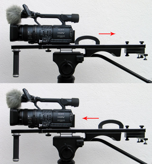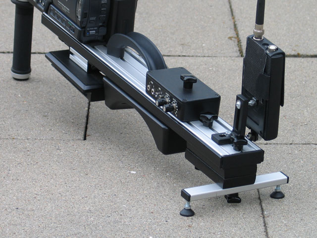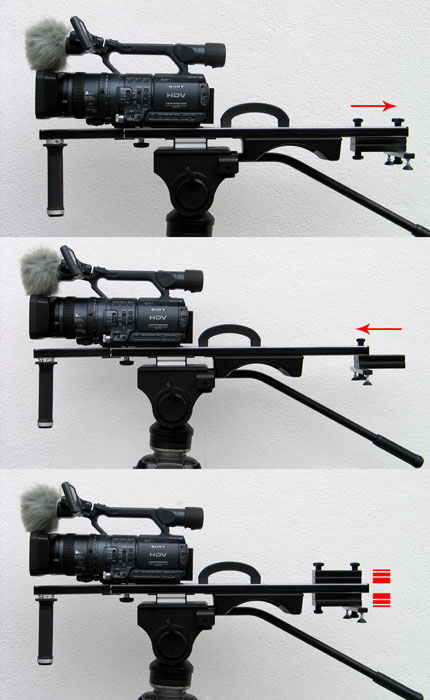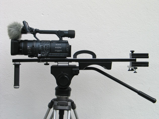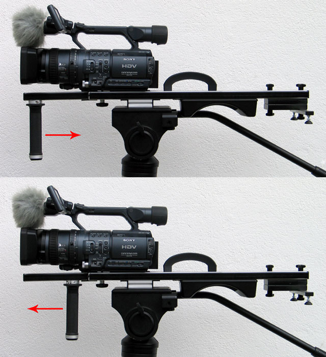 Der mit Moosgummi ummantelte, große Handgriff am vorderen Ende des VSS-09 long ermöglicht die exakte Kameraführung auch mit nur einer Hand, die andere bleibt für die Kamerabedienung frei. Die Schulterstütze ist sowohl für Links- als auch für Rechtshänder geeignet. Am hinteren Ende der Profilschiene können Gegengewichte angebracht werden. Zahl und Position sind flexibel. Je nach individuellen Wünschen und verwendetem Camcorder, kann damit eine gute Austarierung erreicht werden. Wünschenswert wäre ein Video-Pin, der die verdrehsichere Montage des Camcorders gewährleistet. Nur mit Stativschraube und Gummimatte kann es passsieren, dass der Camorder beim Arbeiten nach links oder rechts aus der Achse gedreht wird.