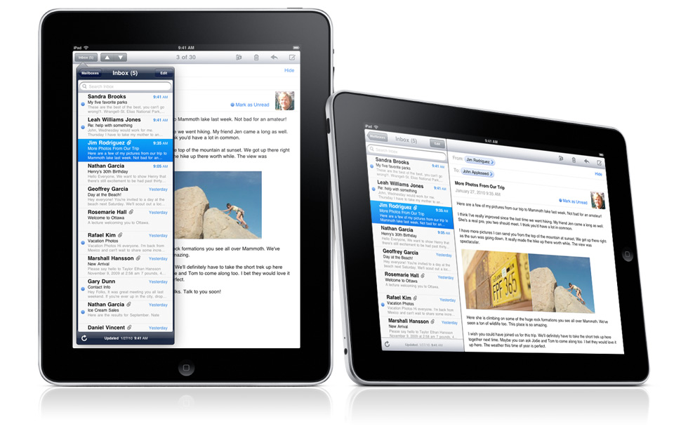 Betrieben wird iPad mit einem Akku, der bis zu zehn Stunden halten und eine vergleichsweise lange Standby-Zeit bieten soll. Beim 9,7-Zoll-Display hebt Apple den großen Betrachtungswinkel von 178 Grad hervor.