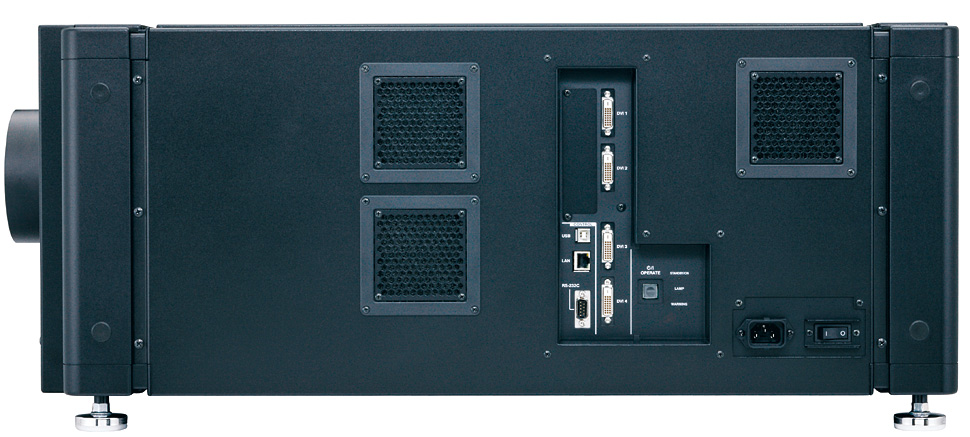 Der Projektor kann nach Herstellerangaben auch zwei oder vier Bilder in WU-XGA-Auflösung darstellen. Für solche Multi-Screen-Projektionen stehen vier DVI-(Dual-Link)-Eingänge zur Verfügung.